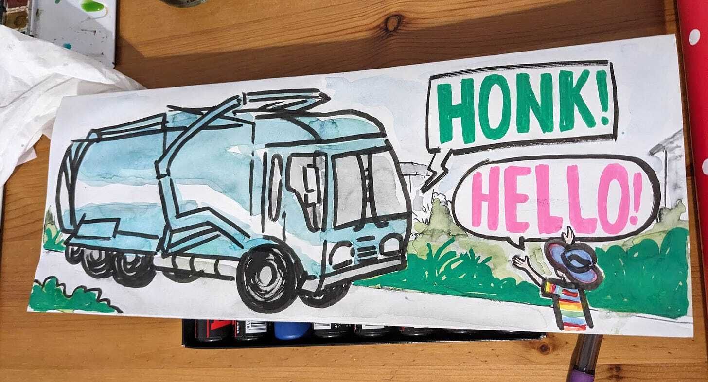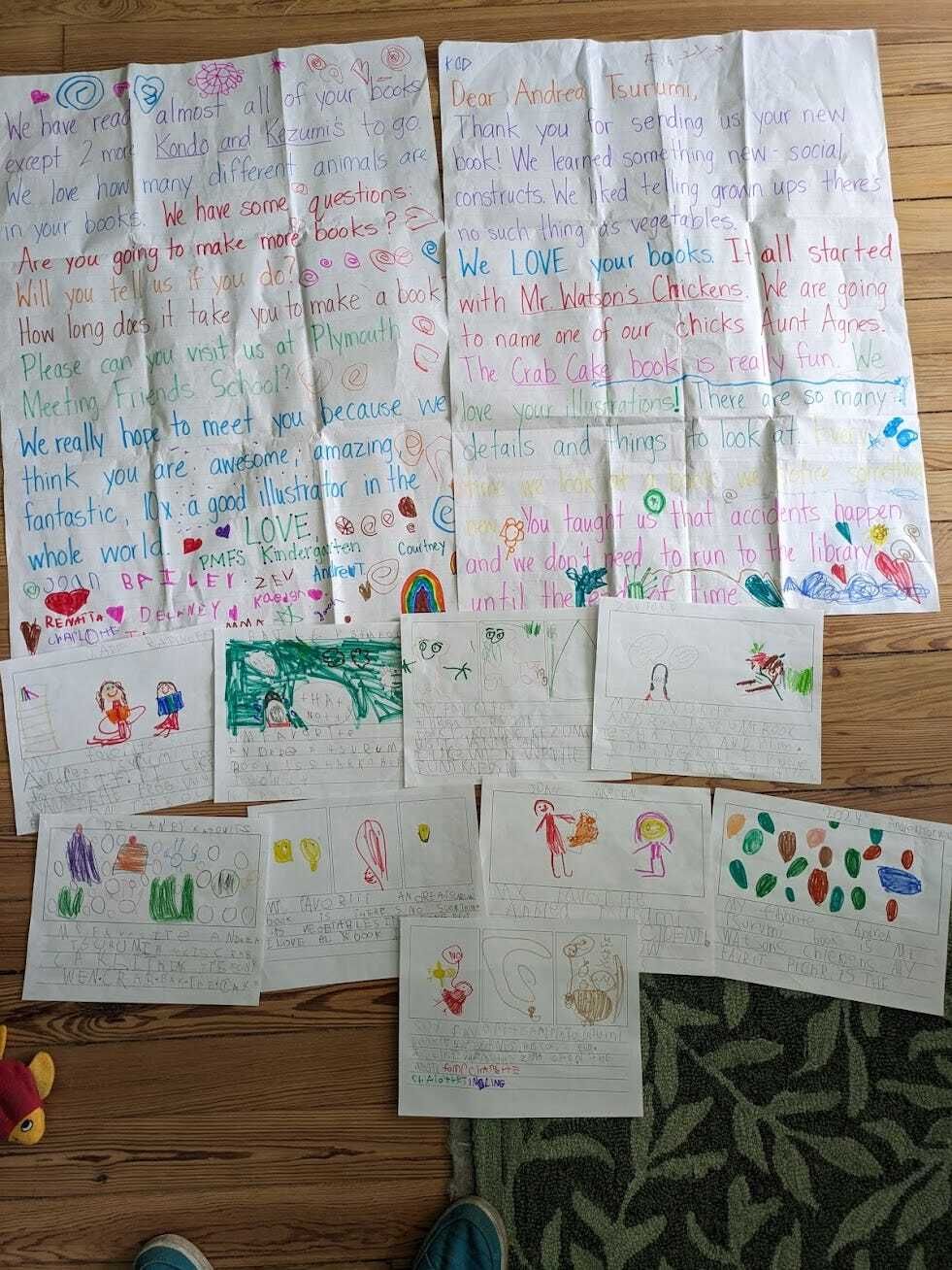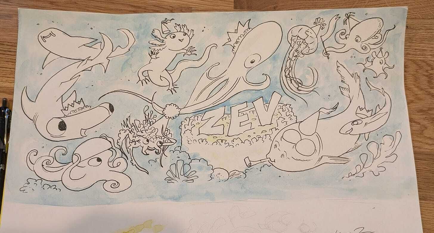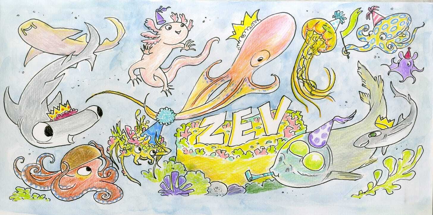 And these amazing drawings from Courtney Singer’s class, which brings me to last week, when a parent of one of these cool kids spotted me walking Spatula down her block and reached out to chat. Turns out her kid’s birthday was coming up, so a card, right? I love finding out what kids’ favorite animals are because they know incredible ones that I’ve never seen before and Zev knows some fantastic sea creatures that sent me down a YouTube rabbit hole, like the Rainbow Blanket Octopus and the Spookfish
