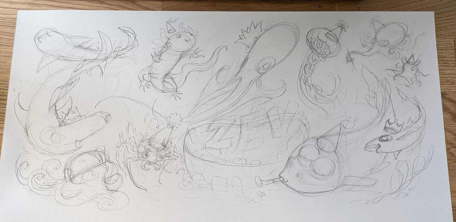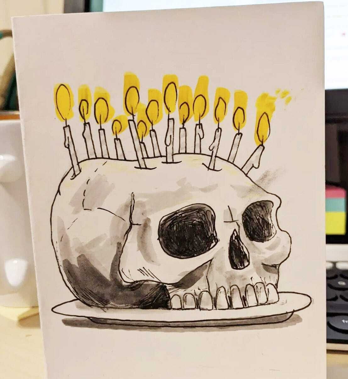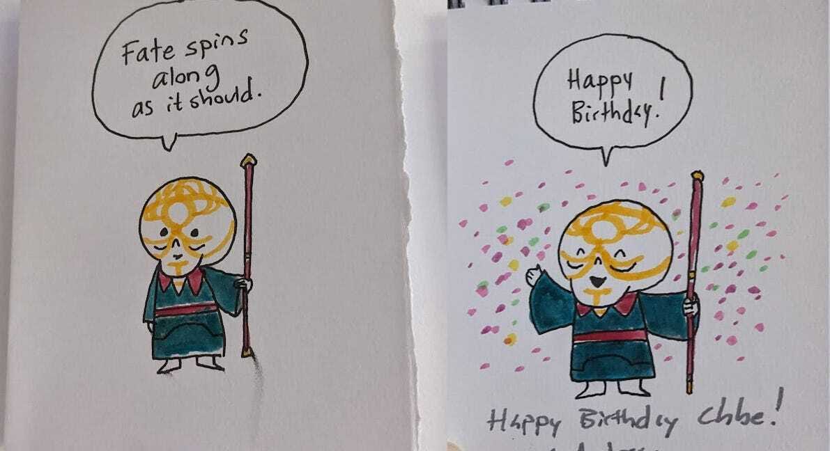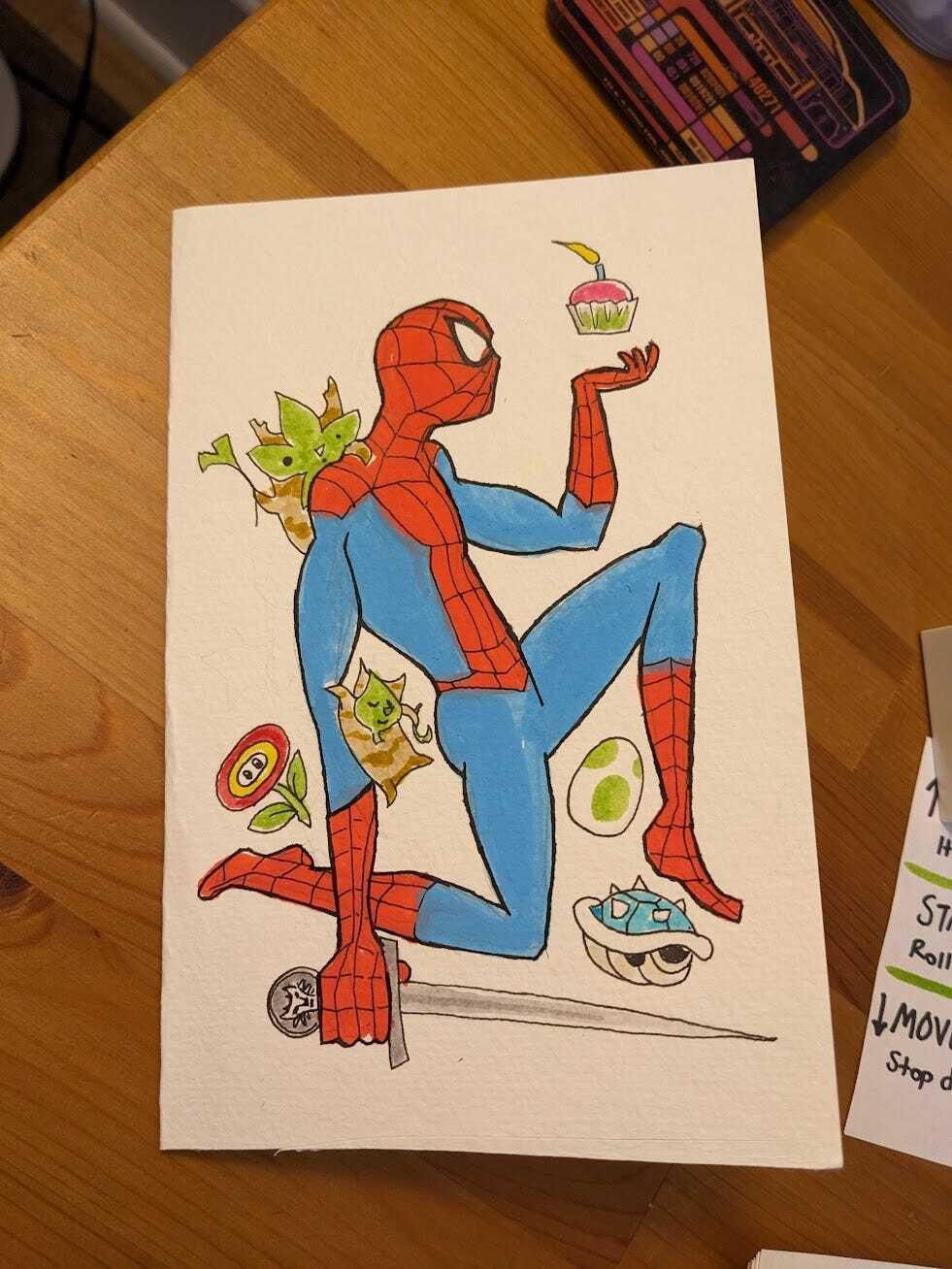 We’ve all, or most of us, drawn birthday cards before, right? It’s some of the first drawing “for” someone I did, and it’s stayed a consistently joyful (when I have spoons for it) type of Making Things. There are no Portfolio Thoughts for a Birthday-Spiderman-with-Witcher-Mario-and-Zelda cameos, you can just go nuts: