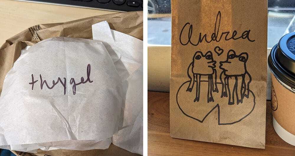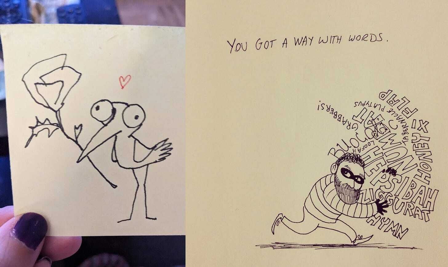 When my spouse and I started dating, we used to leave each other post-it-doodles. Actually, a big doofy monster drawing he clipped to my dorm mailbox answered the “so….does he like, like me?” wondering and started our Define the Relationship talk.And getting cards and doodles and drawings from folks is always THE BEST I keep pretty much all of them:
